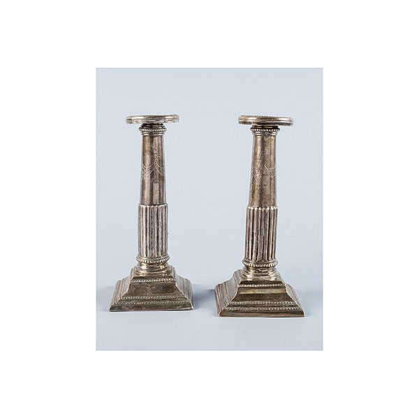En plata cincelada con restos de marcas, parcialmente borradas, (Astorga). Bases rectangulares con decoración de contario y fustes acanalados en la mitad inferior y decoración grabada con festón con motivo de cortinajes en la superior. Mechero circular tambien decorado con motivo de contario. Altura: 19 cm. Peso: 1.247 grs. PUJAR AQUÍ