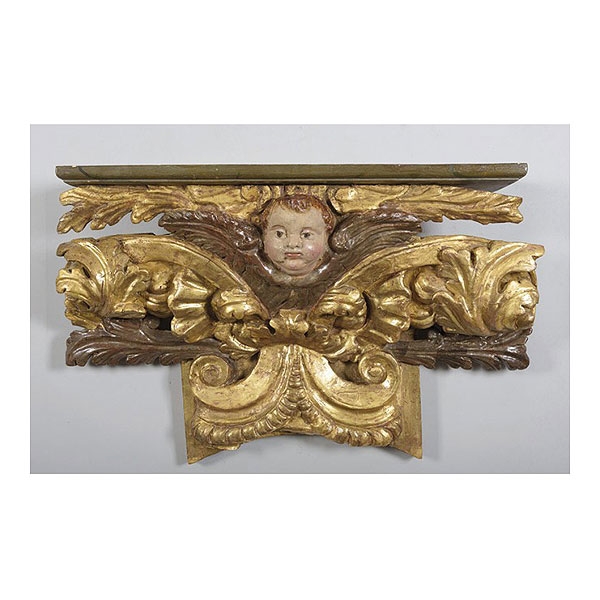 En madera tallada, estucada y policromada. Tablero superior repuesto. Medidas: 53 x 23´5 x 88 cm. PUJAR AQUÍ