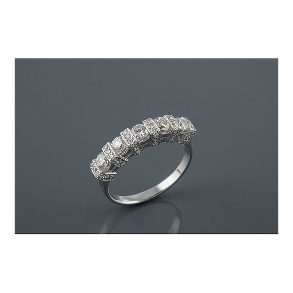 Realizada en oro blanco, con cinco diamantes talla brillante centrales y entrepiezas cuajadas por diamantes talla brillante, peso total aproximado: 1.20 ct. PUJAR AQUÍ