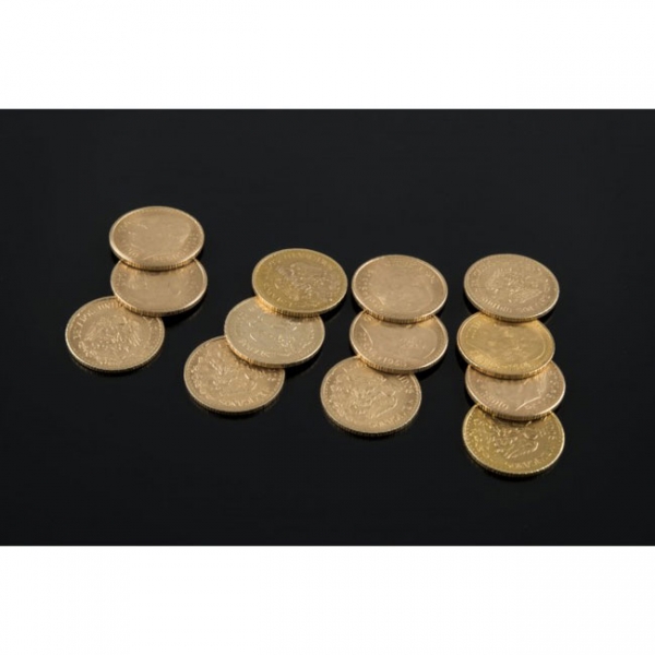 Lote compuesto por trece monedas de oro (Posibles reproducciones). Se acompaña de portamonedas textil.Información adicional