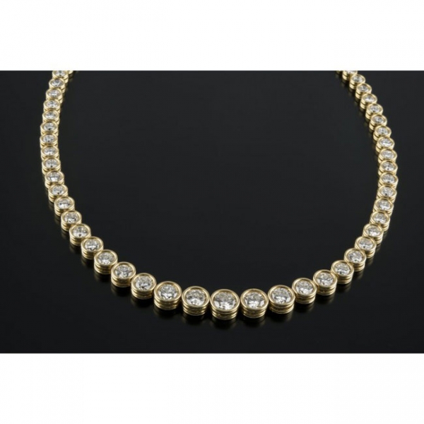 Realizada en oro, tipo rivière, formada por sesenta y cinco diamantes talla brillante engastados en chatón y dispuestos en disminución del centro a los lados, peso total aproximado: 41.06 ct. El cómputo general de los diamantes tiene un color y pureza aproximado: H // VS2-SI1 y están distribuidos: 1 brillante: 2.02 ct. 2 Brillantes: 3.20 ct.2 rillantes:3.05 ct.2 Brillantes: 2.47 ct.2 Brillantes: 2.18 ct.2 Brillantes: 2.02 ct.6 Brillantes: 4.74 ct.2 Brillantes: 1.30 ct.12 Brillantes: 7.20 ct.6 Brillantes: 3.22 ct.2 Brillantes: 1.06 ct.11 Brillantes: 4.35 ct.1 Brillante: 0.33 ct.3 Brillantes: 0.95 ct.11 Brillantes: 2.97 ct.Información adicional