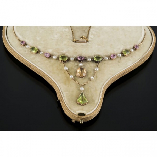 Realizada en oro de segunda ley, compuesta por turmalinas y peridotos de diferentes tallas, un topacio talla mixta y perlitas intercaladas. Cadenilla de seguridad posterior. Se acompaña de estuche original de CHAPPLE & MANTELL GOLDSMITHS & JEWELLERS. LONDON.Información adicional