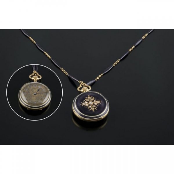 Realizado en oro tipo lepine, de dos tapas. Funciones: horarias y minuteras. Bisel de esmalte blanco y morado. Esfera dorada, numeración arábiga enmarcada en círculos, agujas pavonadas en azul tipo espada. Trasera de esmalte guilloché morado y diamantes talla rosa. Guardapolvo grabado con ocho medallas y Chicago 1893 Genève 1896. Nº 281843. Se acompaña de cadena de oro con eslabones de esmalte guilloché morado. Ligeros deterioros.Información adicional