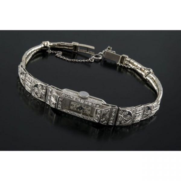 Realizado en platino y oro blanco para señora. Caja rectangular, bisel y pulsera calada con motivos vegetales y geométricos formados por diamantes tallas brillante, brillante antigua y 8/8, peso total aproximado: 0.95 ct. ( falta una piedra ). Funciones: horarias y minuteras. Esfera plateada, numeración arábiga y agujas tipo bastón. Sistema de carga manual. Brazalete de platino y oro blanco.( deterioros ).Información adicional