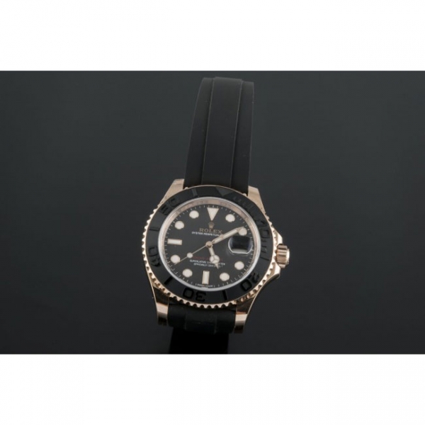 Realizado en oro rosa para caballero. Caja redonda, bisel giratorio bidireccional con graduación de 60 minutos. Funciones: horarias, minuteras, segunderas y calendario. Esfera negra, numeración de puntos de tritio, agujas luminiscentes, ventana con lente Cyclops para calendario a las 3h. Sistema de carga automático. Brazalete original Oysterflex provisto de un sistema de "cojines" laterales que estabilizan el reloj en la muñeca y cierre de seguridad desplegable Oysterlock en oro rosa.Nº:120554K6.Información adicional