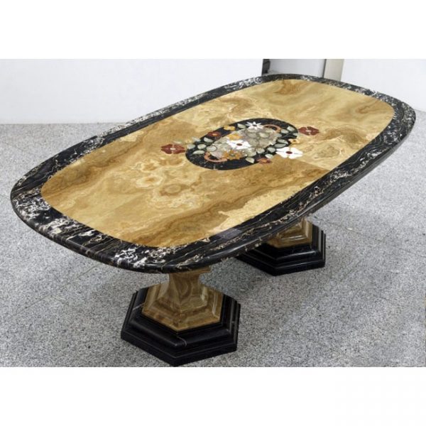 Tablero y doble apoyo en travertino y alabastro de palombara y perímetro en mármol negro veteado. Centro decorado con motivo de flores en piedras duras. Medidas: 75 x 106 x 220 cm.