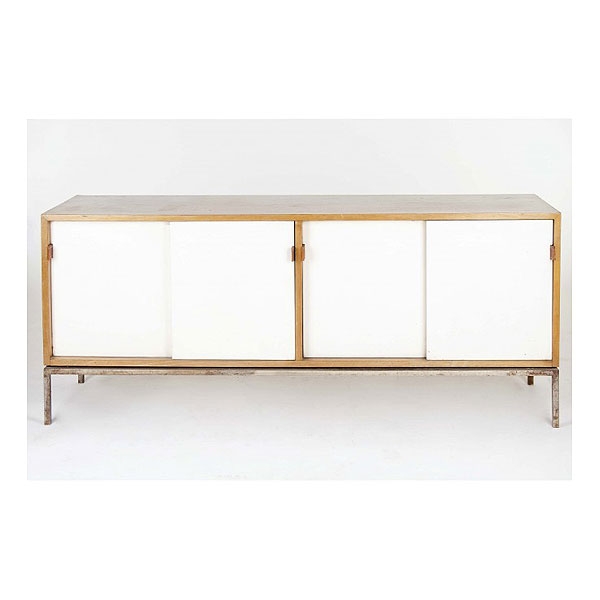 En madera de nogal sobre base metálica cromada. Frente con cuatro puertas correderas policromadas en blanco con tiradores en piel. Deterioro de uso.