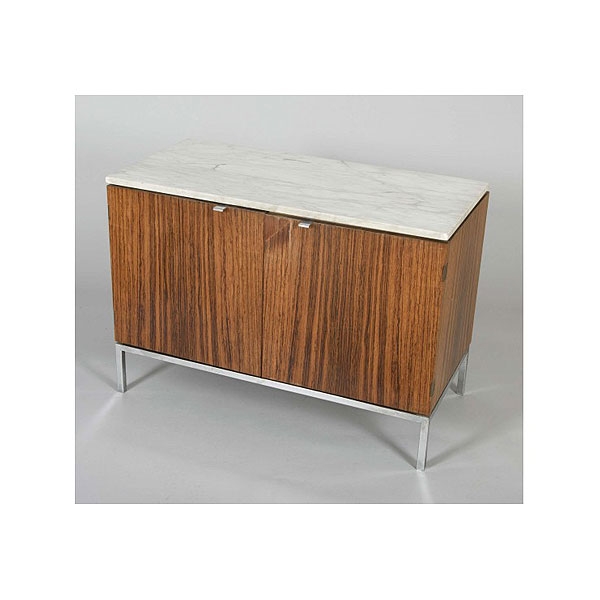 Madera con hoja de palisandro. Puertas con tiradores de metal, base cromada y tapa de mármol italiano. Interior en madera de limoncillo.