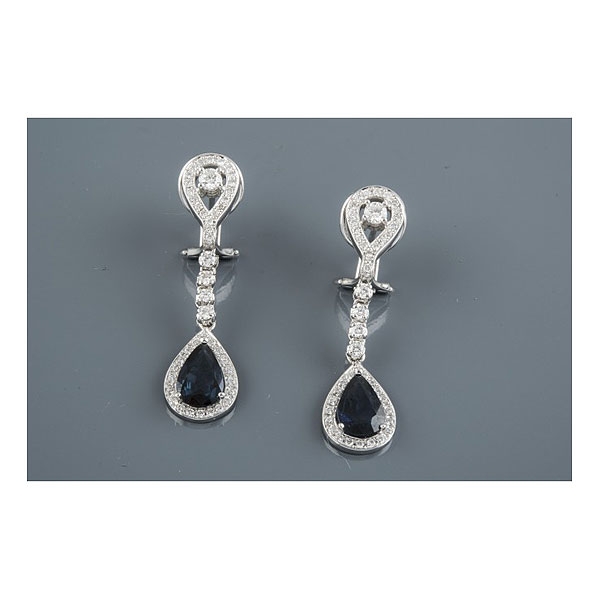 Realizados en oro blanco, parte superior aperillada, barrita y orla de diamantes talla brillante, peso total aproximado: 1.30 ct.y dos zafiros talla perilla, peso total aproximado: 3.44 ct.