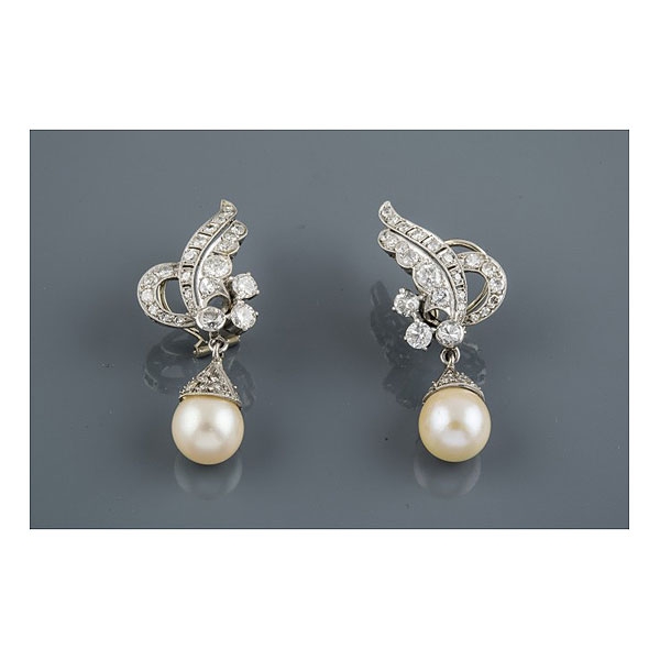 Realizados en platino, parte superior en forma de cintas cuajadas de diamantes tallas brillante y 8/8, peso total aproximado: 2.36 ct. rematados en casquilla con diamantes tallas brillante y rosa, peso total aproximado: 0.16 ct con dos perlas cultivadas calibradas en 9.5 mm.