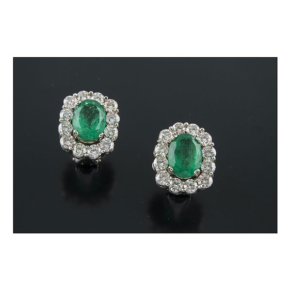 Realizados en oro blanco, con dos esmeraldas centrales talla oval, peso total aproximado: 6 ct. orladas por diamantes talla brillante, peso total aproximado: 3.10 ct.