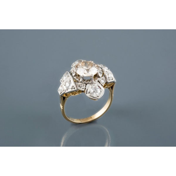 Realizada en oro y vistas de oro blanco, con diamante central talla brillante, peso aproximado: 1.44 ct. ( lascado ) acompañado por diamantes talla brillante antigua, peso total aproximado: 0.51 ct. y diamantes talla rosa. Fecha de fin 18/01/2018 a las 12:41:00