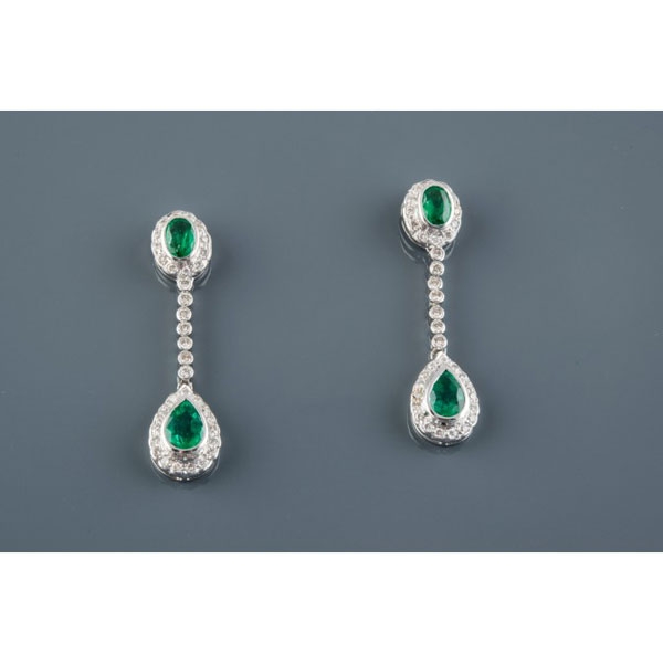 Realizados en oro blanco, parte superior con dos esmeraldas talla oval y parte inferior con dos esmeraldas talla perilla, peso total de todas las esmeraldas: 2.80 ct., orladas y unidas por diamantes talla brillante, peso total aproximado de todos los diamantes: 1.40 ct. Fecha de fin 18/01/2018 a las 12:50:00