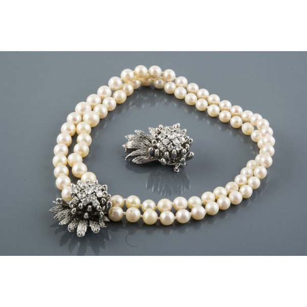 De dos vueltas de perlas cultivadas, calibradas entre 7 mm y 9.5 mm., con cierre de oro blanco, representando un motivo vegetal, cuajado de diamantes talla brillante antigua. Se acompaña de broche gemelo de oro blanco y diamantes talla brillante antigua. Peso total aproximado de todos los diamantes: 4.35 ct. Fecha de fin 18/01/2018 a las 18:15:00