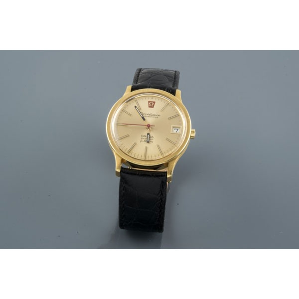 Realizado en oro para caballero. Caja redonda con bisel ligeramente estriado. Funciones: horarias, minuteras segunderas y calendario. Esfera de color oro, numeración baquetonada, agujas luminiscentes, segundero central en rojo y ventana para calendario a las 3h. Correa de piel negra, con hebilla Omega de metal chapado. Se acompaña de estuche original de color rojo. Fecha de fin 18/01/2018 a las 19:34:00