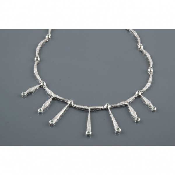 Realizada en oro blanco, formada por diamantes talla brillante, peso total aproximado: 0.94 ct, y esmeraldas talla redonda, peso total aproximado: 0.40 ct.