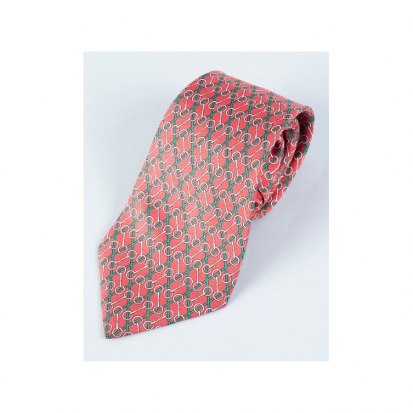 En seda, con motivos decorativos de anillas y rombos sobre fondo rojo.