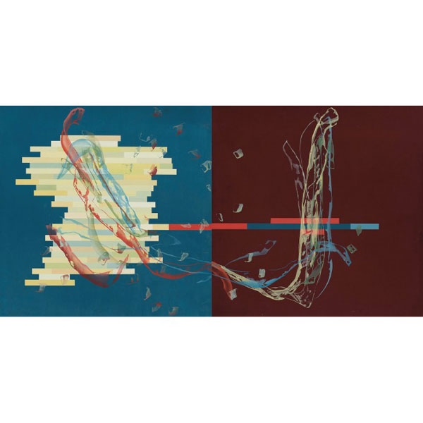 Los colores primarios, una constante en su obra, se oponen, el azul y el rojo, como campos en los que Broto actua con capas de pintura muy liquida a modo de veladuras y recurriendo a la tecnica del dripping y lineas horizontales a modo de cintas adhesivas remarcando el geometrismo de la composición.