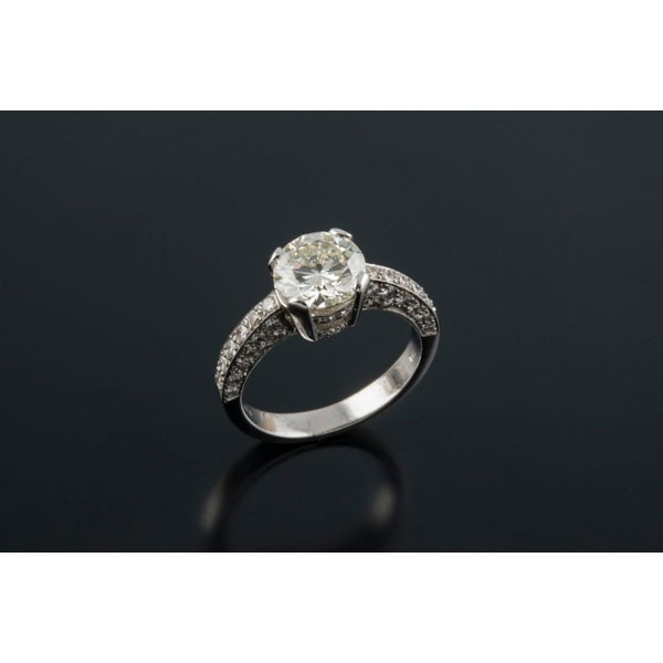 Realizada en oro blanco, tipo solitario, formada por un diamante central talla brillante, peso aproximado: 1.66 ct. en montura fantasía cuajada de diamantes talla brillante, peso total aproximado: 0.65 ct.