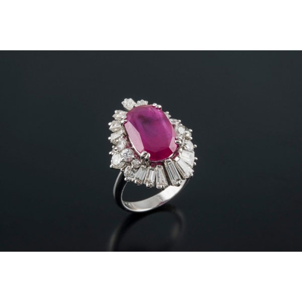 Realizada en oro blanco, con rubí central talla oval, peso aproximado: 8.14 ct. orlado por diamantes tallas brillante y baguette, peso total aproximado: 4.24 ct.