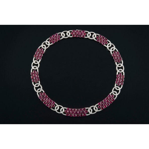 Realizada en oro blanco, compuesta por rubíes talla oval dispuestos en motivos de tres bandas, peso total aproximado: 52.78 ct. unidos por eslabones redondos cuajados de diamantes talla brillante, peso total aproximado: 6.03 ct