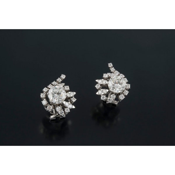 Realizados en oro blanco, compuestos por dos diamantes centrales talla brillante, con un peso y unos valores de color y pureza aproximados de 2.19 ct. H-I // SI1 (presenta dos perforaciones láser) y 2 ct. I.J // SI1 respectivamente según fotocopia adjunta de Dictamen Gemológico Nº D-6897 del Instituto Gemológico Español (IGE), acompañados de diamantes talla brillante, peso total aproximado: 1.40 ct.