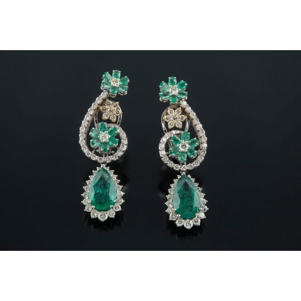 Realizados en oro blanco y oro, con decoración ondulada y motivos florales compuestos por diamantes talla brillante, peso total aproximado: 4.97 ct. acompañados por esmeraldas tallas oval y perilla, peso total aproximado: 14.28 ct.