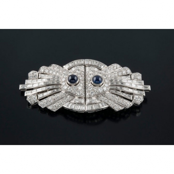 Realizado en platino compuesto por motivos geométricos, con dos zafiros talla redonda cabujón y diamantes tallas brillante, brillante antigua y baguette, peso total aproximado: 16.50 ct. Marcas francesas. Firmado: J.FUSET.