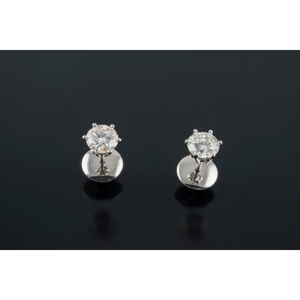 Realizados en oro blanco, tipo dormiloma, formados por dos diamantes talla brillante engastados en garras de seis puntas, con un peso aproximado de 1.17 ct y 1.23 ct. respectivamente.
