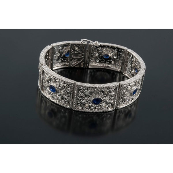 Realizada en oro blanco, formada por siete placas rectangulares caladas, de diseño vegetal, cuajadas de diamantes talla brillante, peso total aproximado: 4.30 ct. y siete zafiros centrales, peso total aproximado: 7.40 ct.