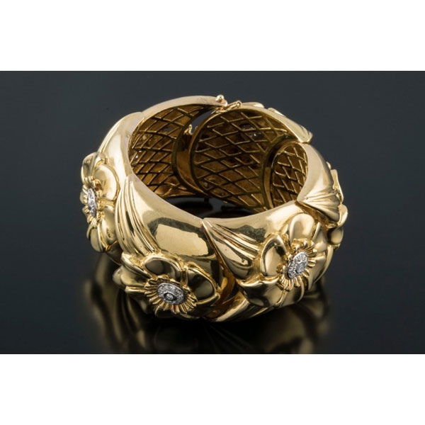 Realizado en oro y oro blanco, con eslabones móviles y decoración floral acompañados por diamantes talla brillante, peso total aproximado: 0.90 ct. Cierre con dos ochos de seguridad.