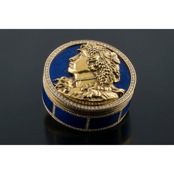 Realizada en oro, de forma circular. Tapa y contorno recubiertos por placas de lapislázuli, gran medio relieve central representando un busto de perfil tocado con racimos y hojas de vid, y, en el cuello, gargantilla formada por doce diamantes talla brillante.