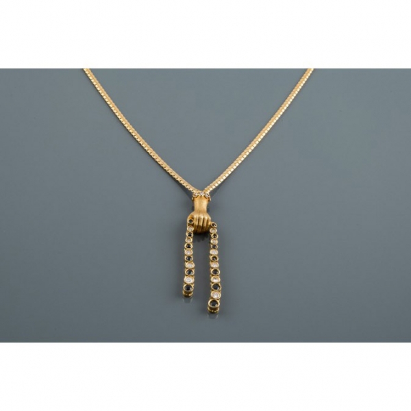 Realizada en oro con motivo central formado por una mano que sostiene una cuerda de diamantes talla brillante, peso total aproximado: 0.55 ct. y zafiros talla redonda.