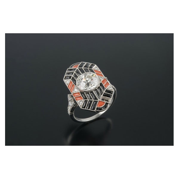 con placas de ónix y coral facetadas creando motivos geométricos (falta una pieza), y diamantes talla brillante, peso total aproximado: 0.25 ct.