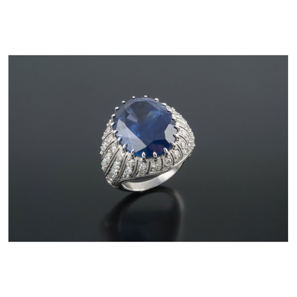 Realizada en platino, compuesta por un zafiro central talla oval, peso aproximado: 19.47 ct.