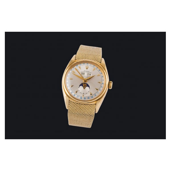 Realizado en oro para caballero, año 1953/1954. Caja redonda, bisel liso, tapa a rosca y corona original super Oyster. Funciones: horarias, minuteras, segunderas, triple calendario y fases de luna.