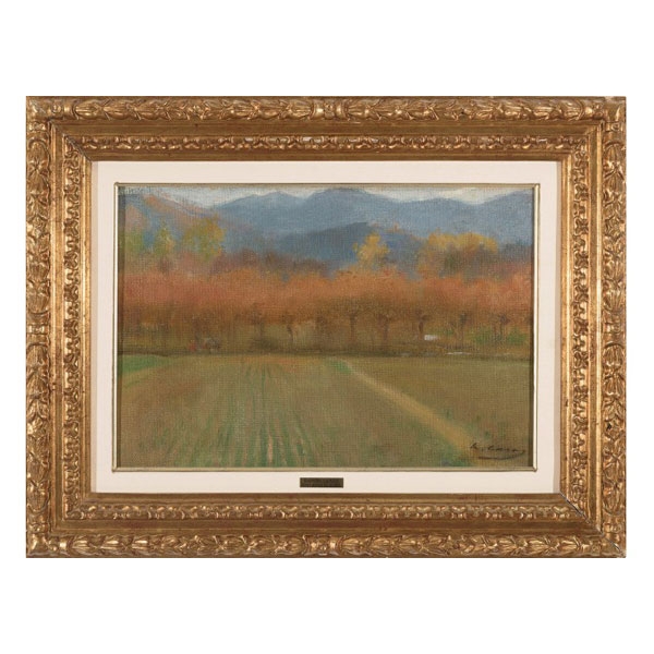 En 1907, la familia Casas adquiere el desamortizado monasterio de Sant Benet de Bagés, cerca de Barcelona, encargando su reforma al arquitecto Puig i Cadafalch. El monasterio se convirtió en su residencia de verano y en él, Casas pintó en numerosas ocasiones el claustro, los jardines y los distintos paisajes de sus alrededores. Varias de estas obras se conservan hoy en día en la Casa Museo. Con su gran capacidad para la captación de formas y masas, Ramón Casas pinta este paisaje de otoño, destacando los justos matices de luz, la composición equilibrada y la ambientación serena de la mano de su delicado pincel.