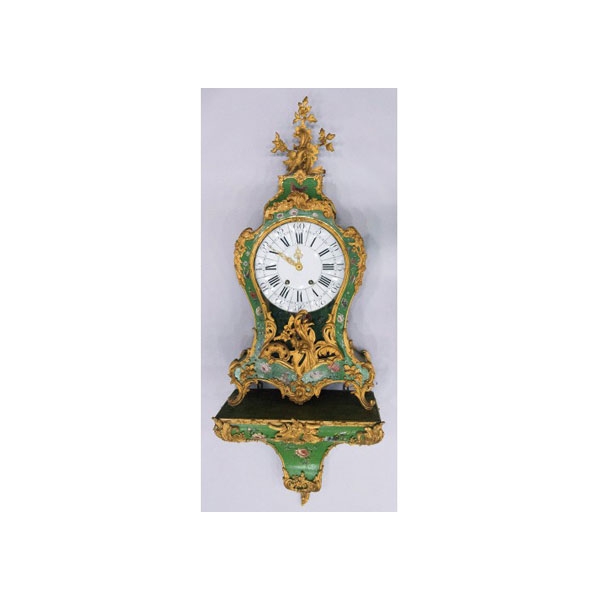 En madera policromada en verde con motivo de rosas y aves. Decorado con bronces dorados aplicados de rocallas, roleos vegetales y ramas de flores.