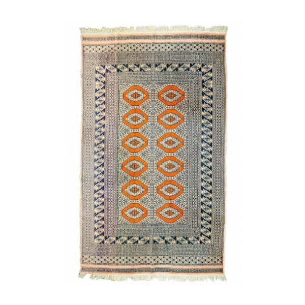 Campo en color beige, decorado con doce rombos en naranja y rica decoración de carácter geométrico en negro.