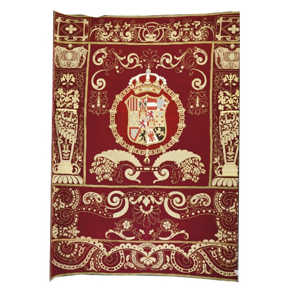 Campo en color granate decorado con el escudo de España, flanqueado por columnas a modo de jarrón con flores, los cuernos de la abundancia y roleos vegetales en beige.