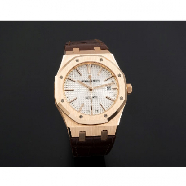 Esfera plateada con motivo “Gran Tapicería”, índices aplicados y agujas Royal Oak de oro rosa con revestimiento luminiscente, numeración baquetonada y ventana para calendario a las 3h. Sistema de carga automático. Brazalete de piel original con cierre de oro rosa desplegable. Nº: 5614-I93864. Se acompaña de estuche. Peso: 140,90 gr.