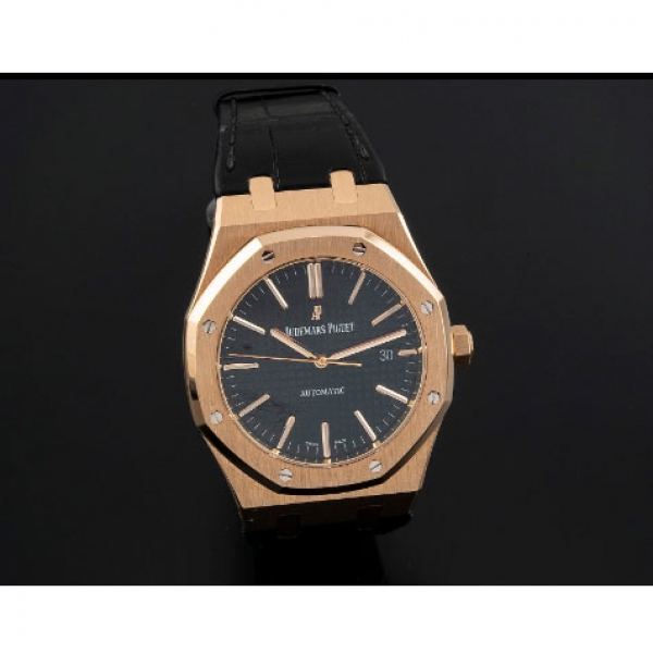 Funciones: horarias, minuteras, segunderas y calendario Esfera negra con motivo “Gran Tapicería”, índices aplicados y agujas Royal Oak de oro rosa con revestimiento luminiscente, corona atornillada. numeración baquetonada y ventana para calendario a las 3h. Sistema de carga automático. Brazalete de piel original con cierre de oro rosa desplegable. Nº2132-I 26872. Se acompaña de estuche. Peso: 143,60 gr.