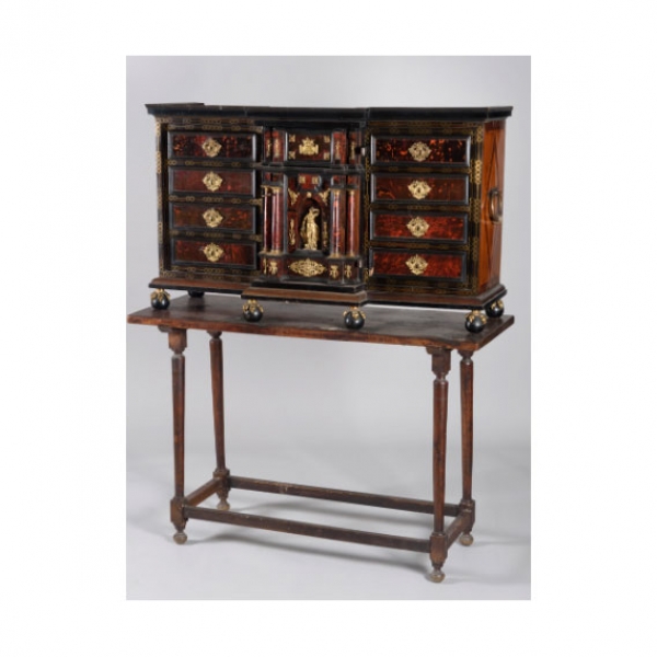 En madera ebonizada. Frente con ocho cajones con los frentes en carey y bocallaves en bronce dorado con dos águilas coronadas.