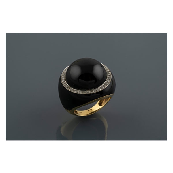 Realizada en oro con cabujón central de oníx, orlado por diamantes talla brillante montados en oro blanco, peso total aproximado: 0.35 ct., y esmalte negro.