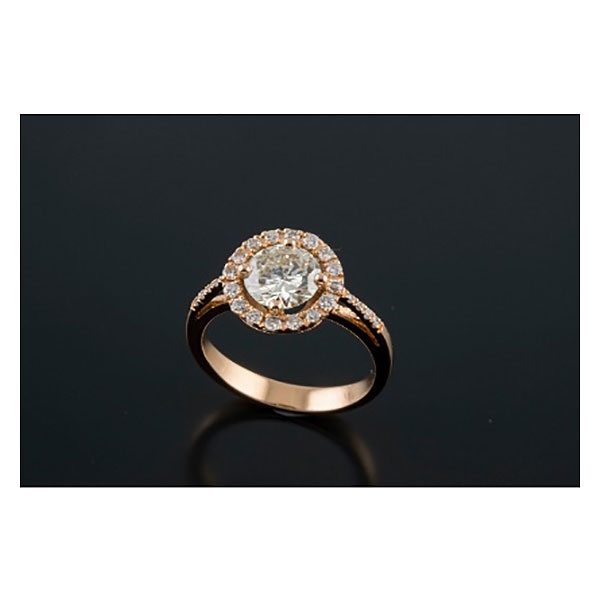 Realizada en oro rosa, compuesta por un diamante central talla brillante montado en garras, peso aproximado: 1.20 ct., orlado por diamantes talla brillante, peso total aproximado: 0.32 ct.