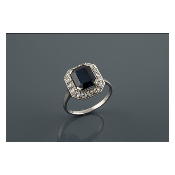 Realizada en platino, compuesta por un zafiro talla rectangular, peso aproximado: 2.67 ct. orlado por diamantes talla 8/8, peso total aproximado: 0.48 ct. Numerada: 8186.