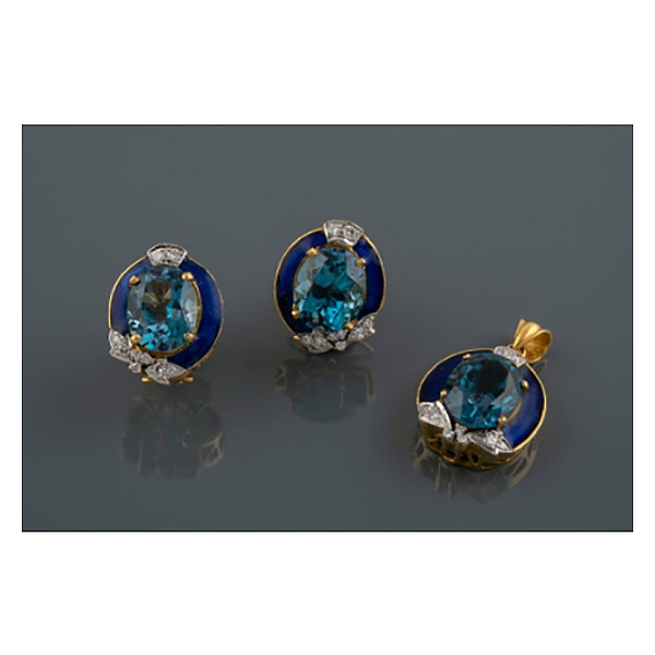Realizados en oro, formados por tres topacios azules talla oval, peso total aproximado: 15 ct., acompañados de diamantes talla brillante, peso total aproximado: 0.30 ct., y detalles de esmalte azul.