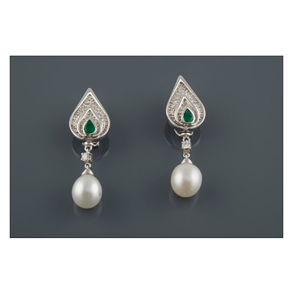 Realizados en oro blanco, parte superior en forma de pera compuesta por diamantes talla brillante, peso total aproximado: 0.85 ct. y dos esmeraldas, rematados en dos perlas australianas calibradas en 10.5 mm.