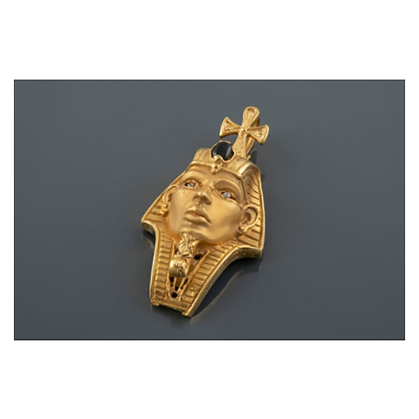 Realizado en oro representando la máscara de un faraón, con zafiro central talla oval y de piedras de imitación incoloras. Reasa en forma de cruz.