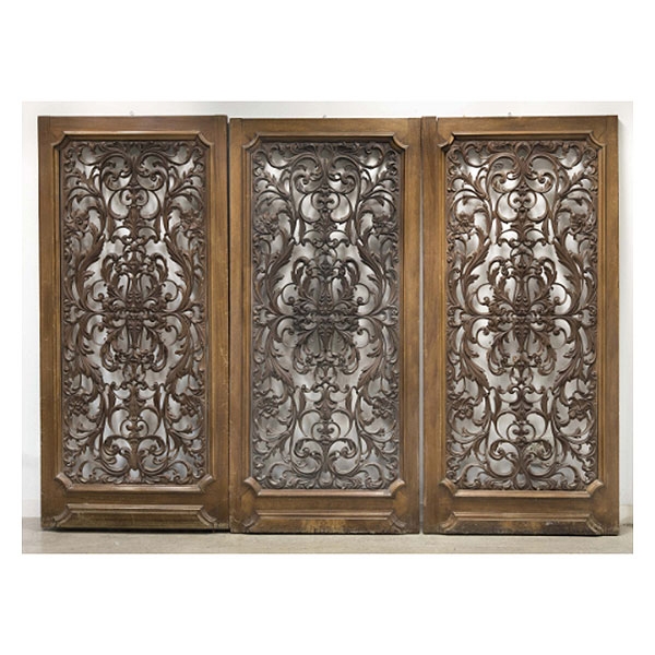En madera tallada y calada, con profusa decoración de roleos vegetales.
